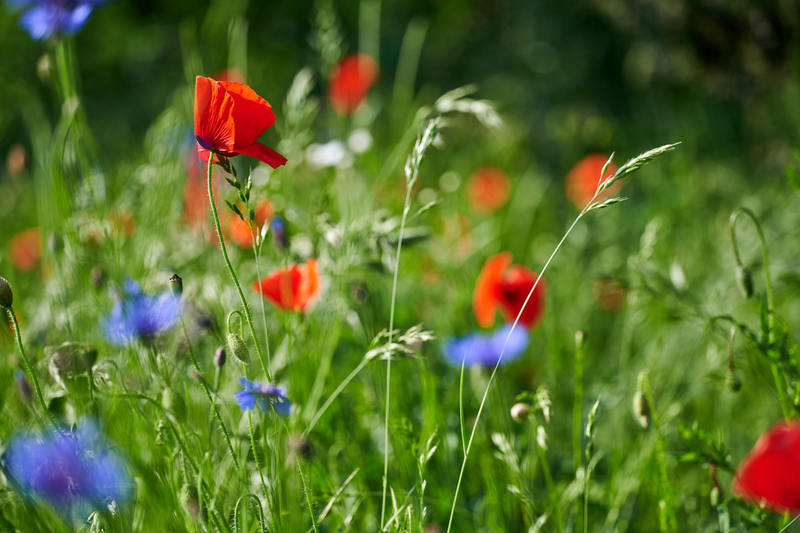Anlage von 5 bis 10 Meter breiten und insgesamt 2-3 km langen Ackerrandstreifen in der Feldflur. Einsaat von regionaltypischen, heimischen Ackerwildkräutern wie z.B. Klatschmohn, Kornblume, Ackerrittersporn, Kamille, Adonisröschen etc.