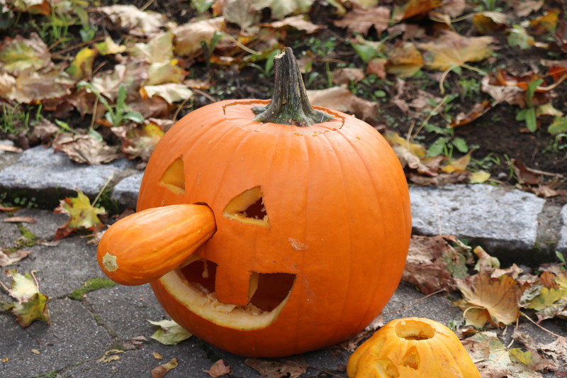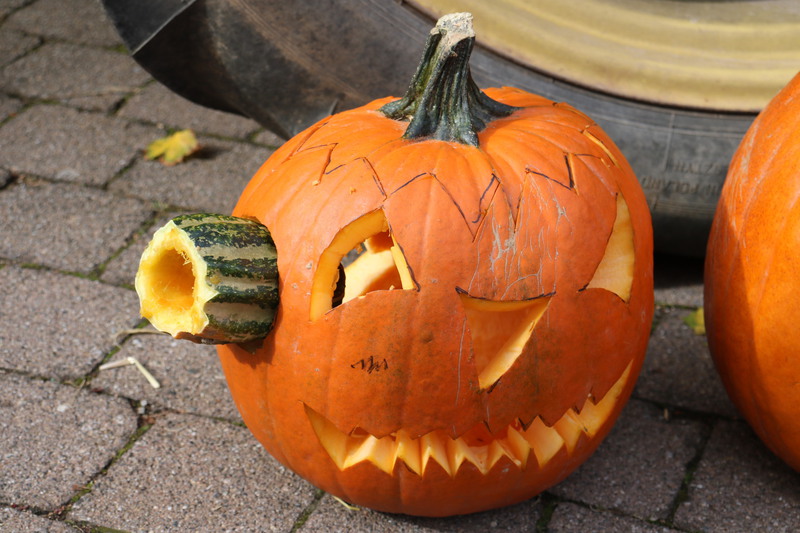 Warum kann man einem Kürbis nur ein Gesicht geben, dieser hat doch zwei Seiten. Denn so hat die Nachbarschaft auch von dem leuchtenden Gesicht etwas.